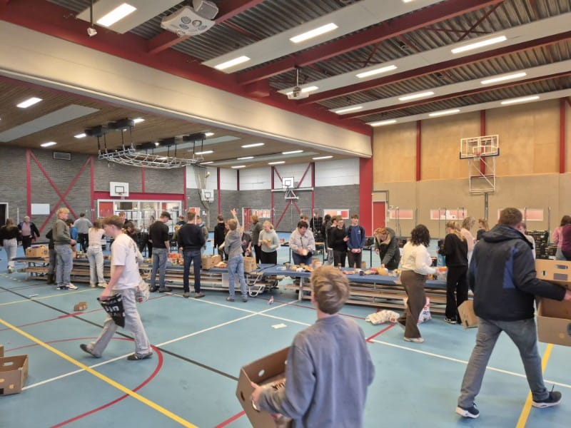 Donderdag zamelden leerlingen overal producten in. Code Hans verzorgde de pendeldienst zodat alles keurig op school werd afgeleverd. De leerlingen van klas 3 en 4 sorteerden de goederen in de sportzaal van school. Het resultaat is geweldig.